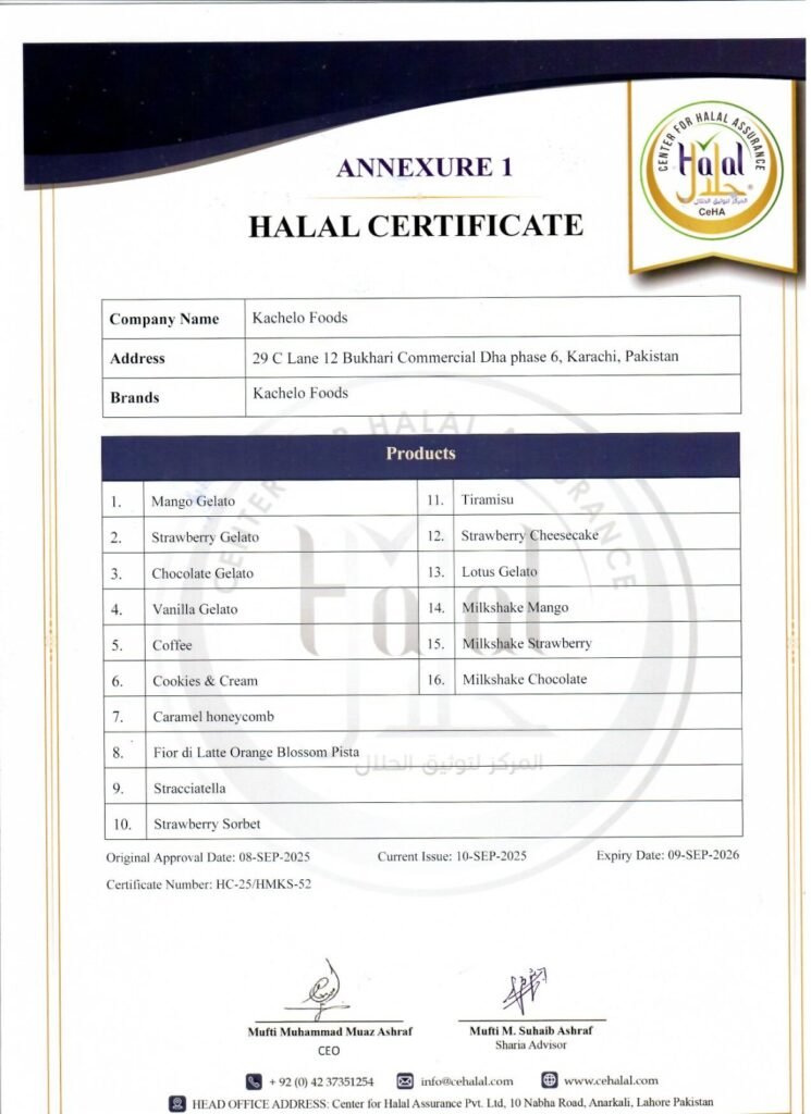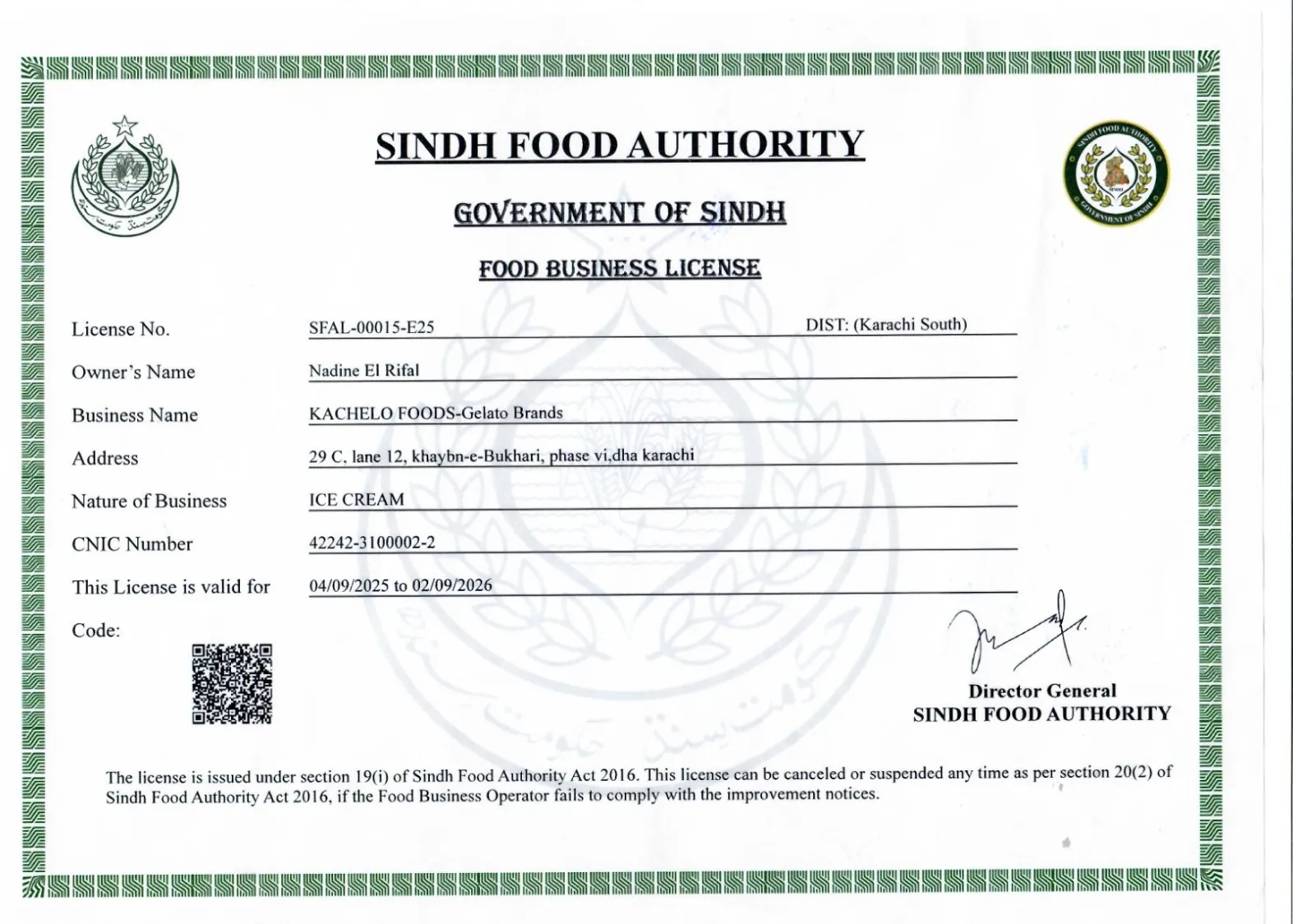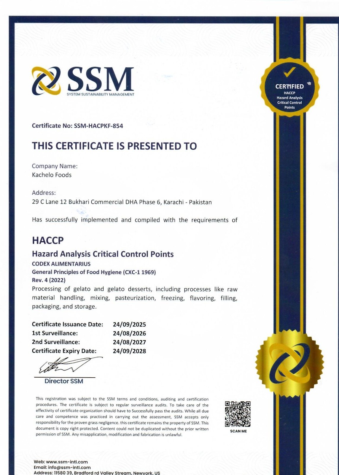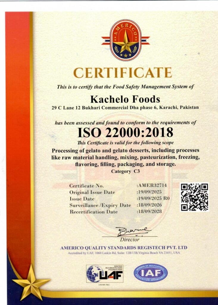 Every scoop of Kachelo Gelato is a reflection of our commitment to quality, safety, & craftsmanship. Our production facilities are fully certified & adhere to international food safety & hygiene standards, ensuring that every flavor you enjoy is made with integrity & care.